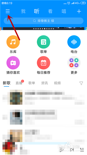 在手机里点击打开酷狗音乐,然后在首页点击左上角的【三】。