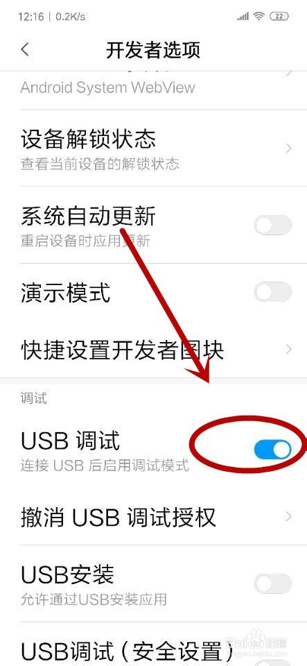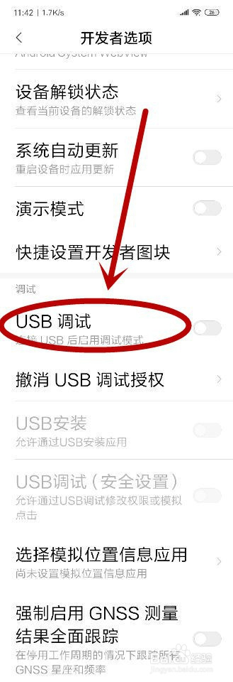 进入“开辟者选项”页面之后,就可以看到第一个选项“开启开辟者选项”后面的开关是蓝色的,暗示该功能已经被打开。找到下面的“USB调节”选项,可以看到该选项是灰色,暗示还没有打开该功能