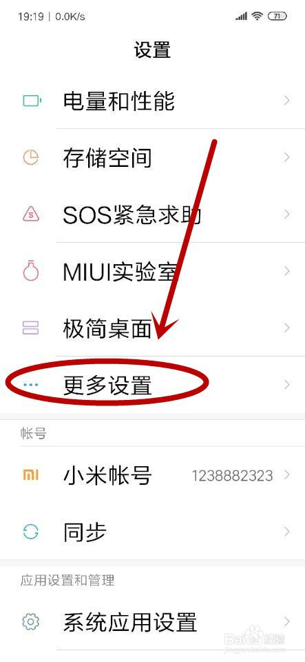 我们在“设置”页面,手指标的目的上滑动,找到“更多设置”并单击