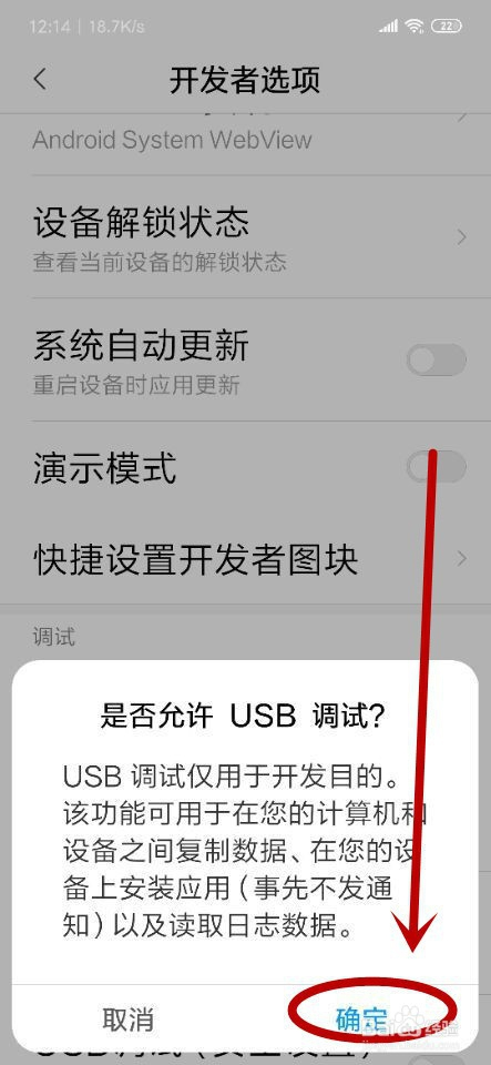 我们单击“USB调节”选项后会弹出一个“是否许可USB调试”对话框,我们单击“确定”