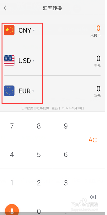 来到汇率转换的页面,默认环境下,有人名币,美元,欧元,这几个,如图所示
