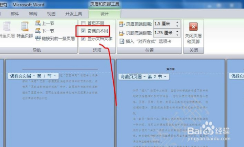 接着,同样在设计窗口中,勾选“奇偶页分歧”,再设置奇偶页的页码即可。