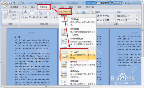 然后“页面结构”——“分隔符”——“分节符—下一页”。