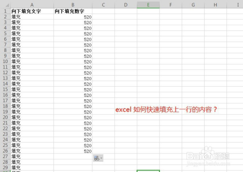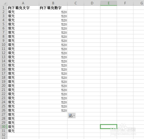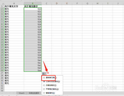 标的目的下填充文字,选中被填充的对象的单位格,点击右下角的节制点,往下拉。