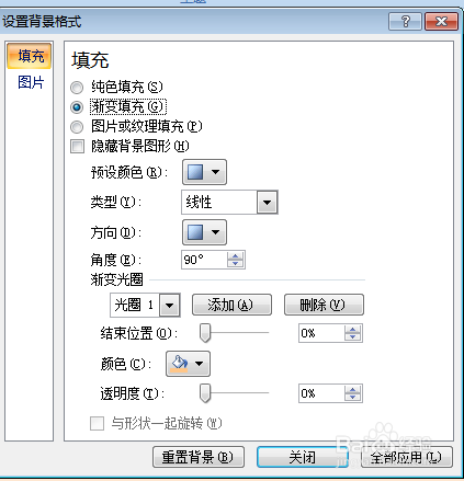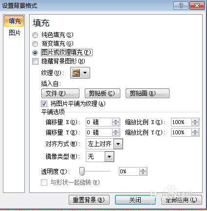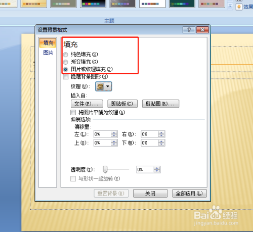 弹出 设置布景格局选项框 有三种填充体例可以选择