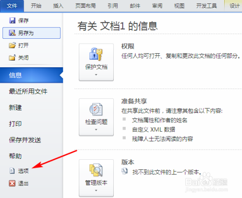 单击【文件】按钮,在打开的菜单中选择【选项】,打开“Word 选项”对话框。