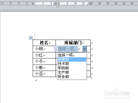 如下图所示,是一份用Word文档建造的填写员工所属部门的表格,此刻需要给所属部分一列的单位格添加下拉菜单。