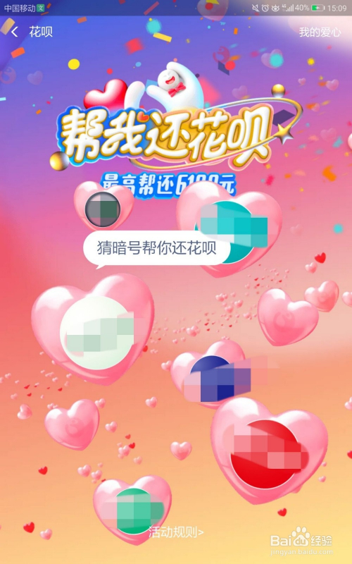 进入帮我还花呗活动页面后,可以看到有很多浮动着的爱心,随便点击一个有品牌名字的爱心。