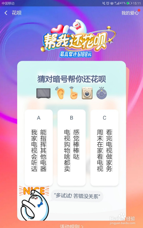 在本年的618活动时代,支付宝又一次推出了“帮我还花呗”的活动,只要猜对记号就可获得爱心,并可在6月19日将其兑换当作花呗还条目红包,那么该活动在哪介入,如何介入呢?快来看看吧。