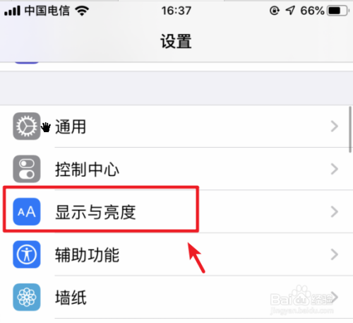进入设置后,在设置列表内,点击显示与亮度的选项。