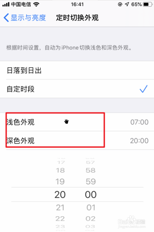 点击今后,也可以点击时候,本身设置切换深色模式的时段。