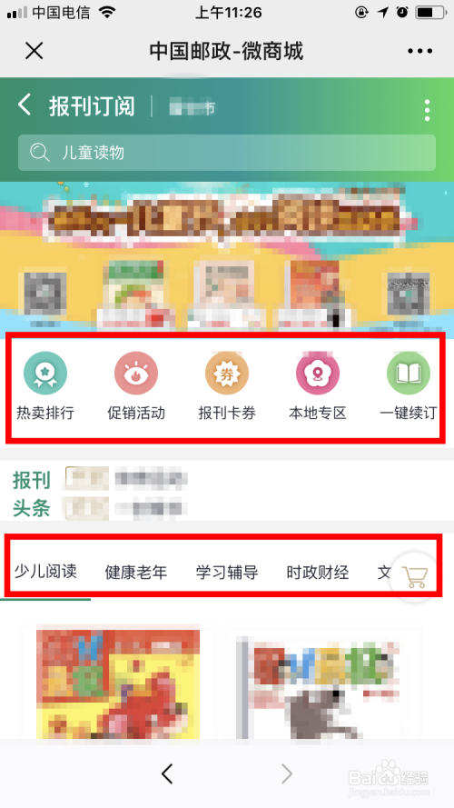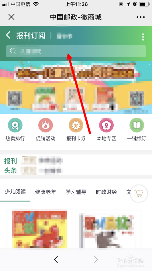 这样我们会进入 中国邮政-微商城 的本家儿页面。然后可以经由过程 热卖排行 、促销活动 、报刊卡券 、当地专区 、一键订阅 ,或者 少儿阅读 、健康老年 、进修教导 、时政财经 等栏目查询本身喜好的报纸杂志。