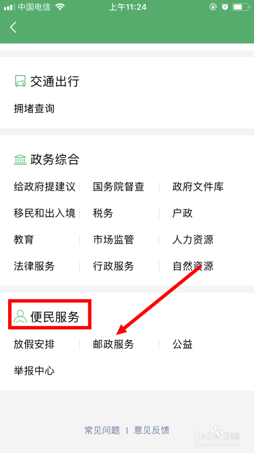 然后在 城市办事 页面的最底部找到 便平易近办事 ,点击下面的 邮政办事 。