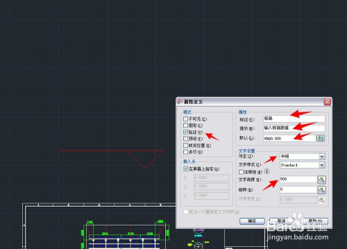 在界说属性界面,模式选择“验证”、写入快的属性,文字高度按照现实图纸比例填写;