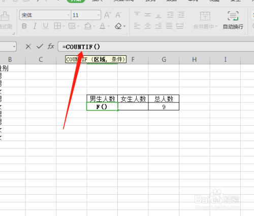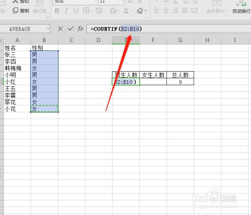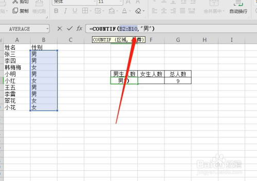输入countif函数的区域,选中所有的性别单位格,B2:B11