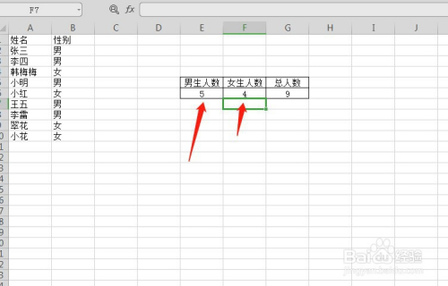 这样男生的人数就显示在选中的单位格里面,同理统计出女生的数目