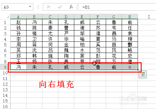 选中A9单位格,标的目的右填充到H9单位格。