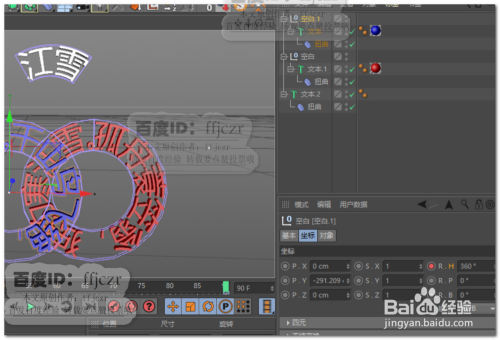 调整变形器在坐标中Z轴的角度,值为90度;在对象属性中点匹配对象;强度为360度。勾选连结纵轴长度。