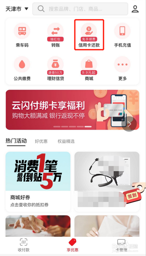 在首页页面上方的浩繁选项中找到信用卡还条目一项,如图所示,点击该选项!(没有的话就点击更多,在更多里找!)
