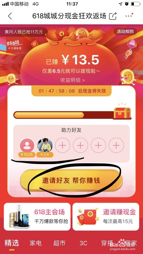 可以看到小编此次是20元就可以提现了,今朝老友助力有13.5元,我们点击邀请老友帮你赚钱