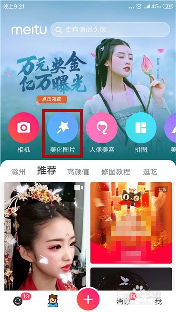 打开手机中的美图秀秀,在首页力度点击顶部的功能【美化图片】。
