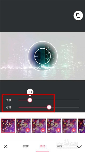 首先默认的是虚化面积是圆形的,下方有两个进度条,第一个是调整虚化的面积,第二个是调整虚化的水平,按照本身的需要调节。