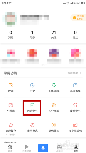 进入到百度浏览器的小我中间后找到【活动中间】并点击,如图所示。