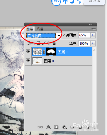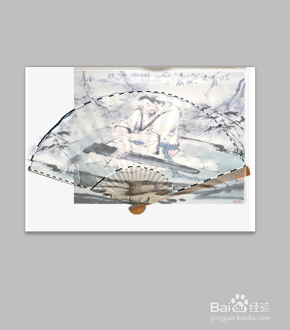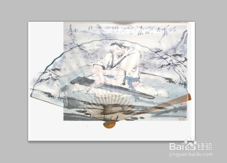 按ctrl+t键调节画面的大小是它与折扇相顺应,设定蒙版东西,点击画笔擦除画面以外的图片部门,把模式调整当作正片叠加,