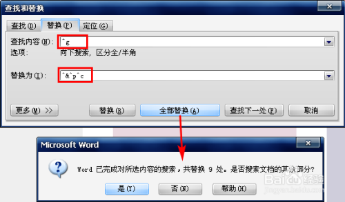 在打开的“查找和替代-替代”对话框的“查找内容”框中输入“^g”,在“替代为”框中输入“^&^p^c”,单击【全数替代】按钮。