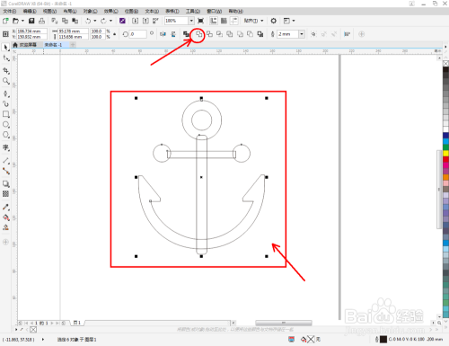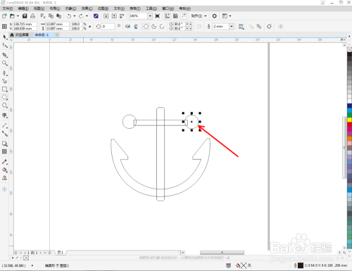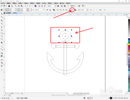 点击【选择东西】,选中图示两圆形图案后,点击【移除前面临象】将前面的圆形区域移除。选中所有图案,点击【归并】将所有图案归并为一体后,鼠标左键点击右边色板中的黑色色块,将船锚图案填充为黑色,这样我们的船锚图标就建造完当作了。