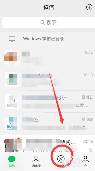首先打开微信,在右下角点击“发现”,进入发现页面