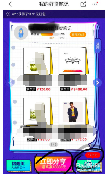 可以看到小编的好货笔记,可以点击右下角红包,看下小编今朝赢取的红包