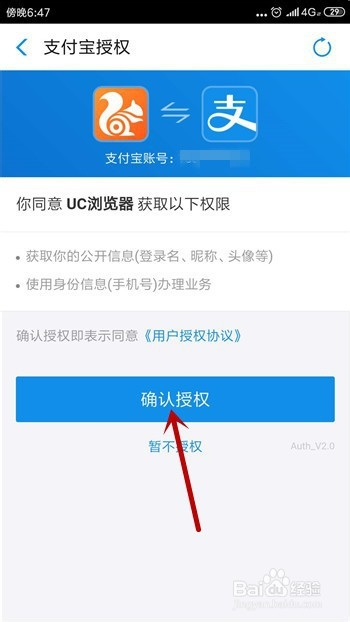 绑定支付宝账号需要响应的授权,点击【确认授权】。
