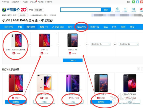 然后进入如图所示的报价详情页面,可以看到,这里可以看到关于小米8的参数、报价、点评、竞品对比等。