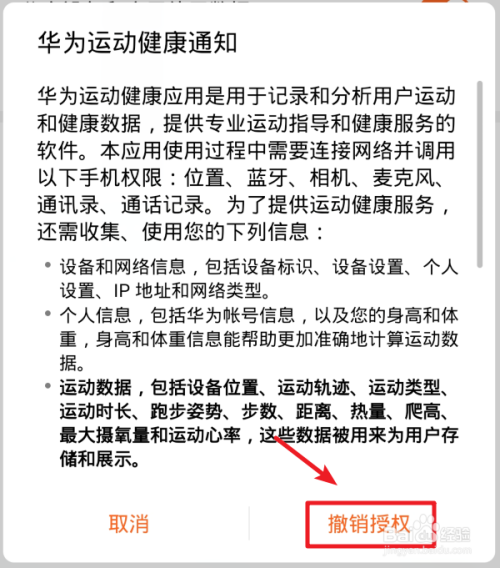 点击进入后,在弹出的窗口中,选择撤销授权的选项,即可封闭活动健康的手机计步功能。