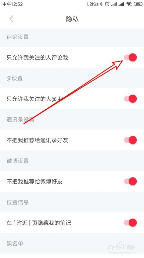 接着在打开的隐私页面中,找到只许可我存眷的人评论我设置项