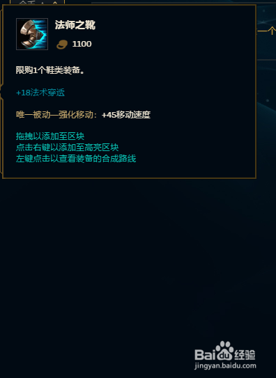 第二件装备,对于刺客法师来说,最好的靴子就是法师之靴,可以装备你增添法穿。