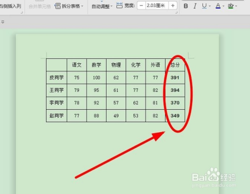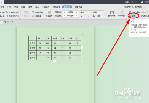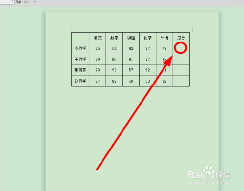 打开一篇带有表格数据的WPS文档,需要在最后一列求出总分