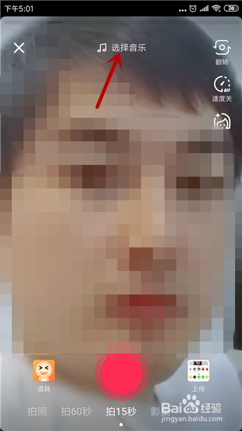 之后就会进入到拍摄视频界面,此时主动给我们加上了超大头的特效,头部的特写很是好玩,我们还需要添加音乐,点击顶部的【选择配乐】。