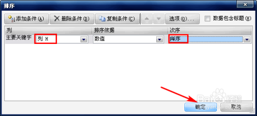 在“排序”对话框中,选择本家儿要关头字为“列 H”,“降序”排序,单击【确定】按钮。