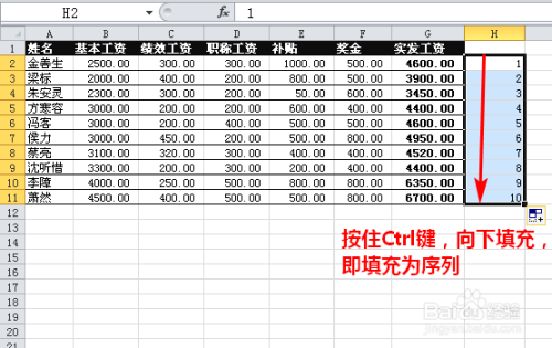 在H2单位格中输入1,然后选中H2单位格,按住Ctrl键,填充到H11单位格,如下图所示: