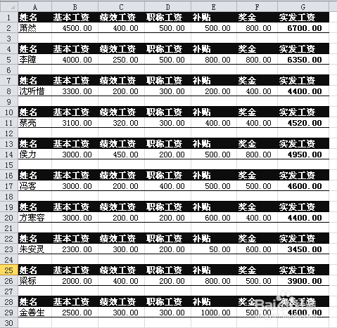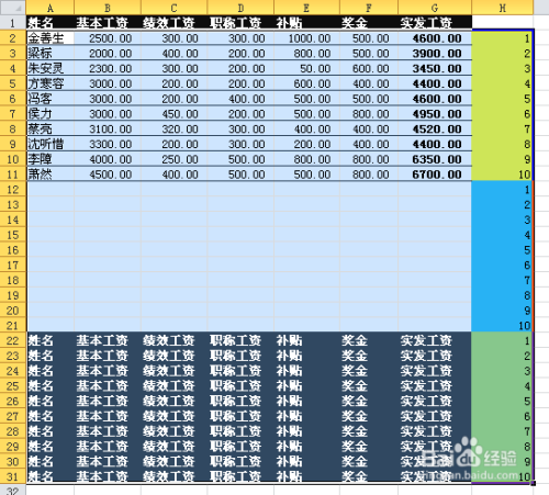 删除多余的第31行和H列。此刻,可以看到表格已经酿成了“题目行+工资行+空行”的形式了。