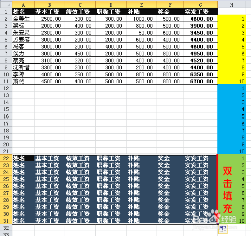 选中A22:H22单位格区域,标的目的下填充到第31行位置(这里可以直接双击填充)。