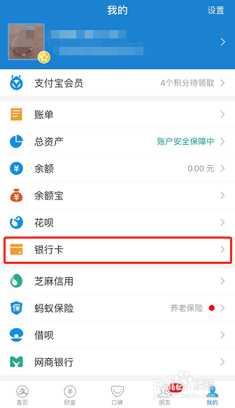 进入我的本家儿页后,在本家儿页下找到银行卡一栏,如图所示,点进此栏!