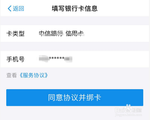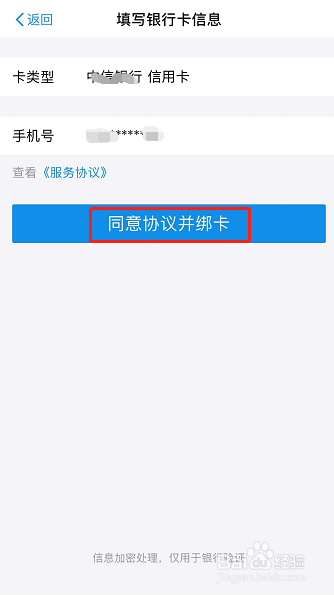 然后查对卡类型和手机号无误后,点击赞成和谈并绑卡,如图所示!