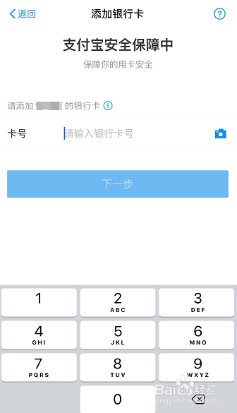 然后进入添加银行卡本家儿页,在本家儿页下卡号后边输入信用卡卡号,然后点击下一步,如图所示!