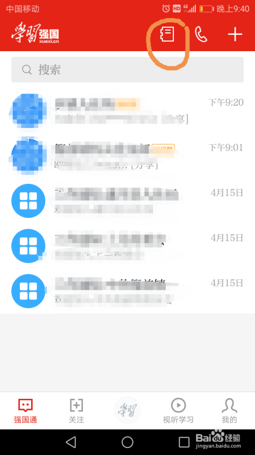 进入“强国通”聊天界面后,再点击右上方通信录标签如下图所示