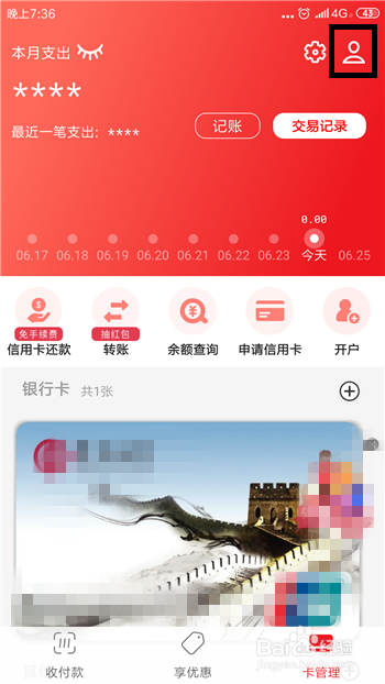 在卡办理界面中点击右上角的【小我中间】,如图所示。