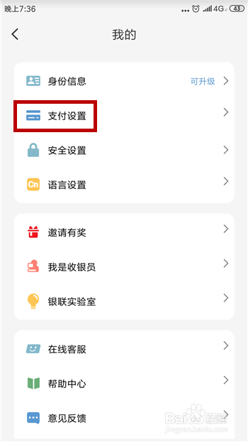 打开了云闪付的小我中间界面后找到【支付设置】并点击。