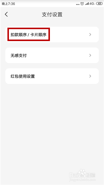 然后在支付设置里就能看到【扣条目挨次/卡片挨次】,点击它。